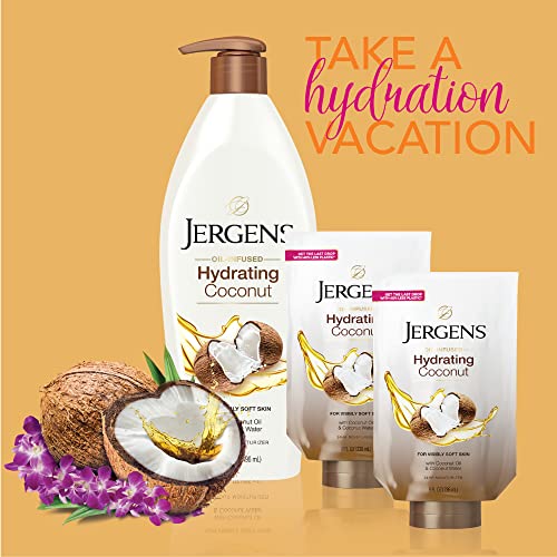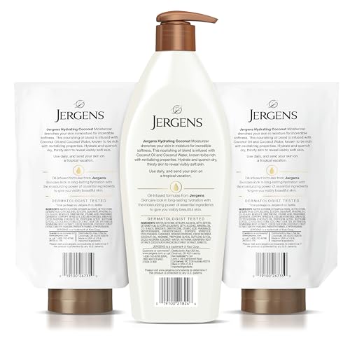 Specification: Jergens Coconut Oil-Infused Hand and Body Moisturizer, Soothing Full-Body Moisture, with Hydrating Coconut, Oil-Infused Lotion, 16.8 oz plus 2 – 8 oz Refills, 3 Piece set