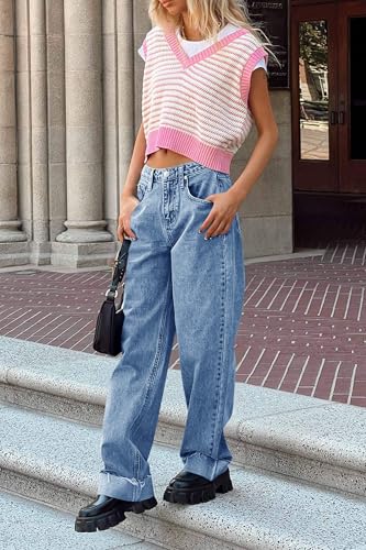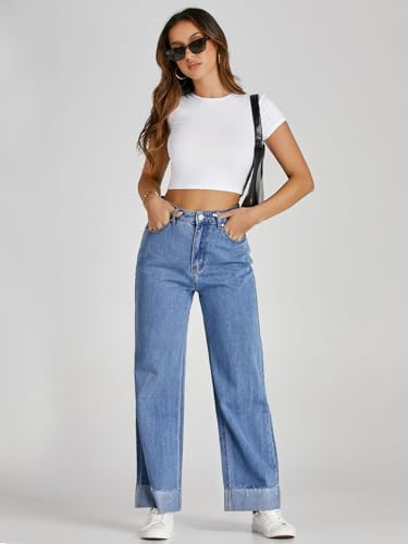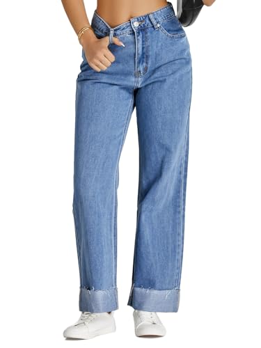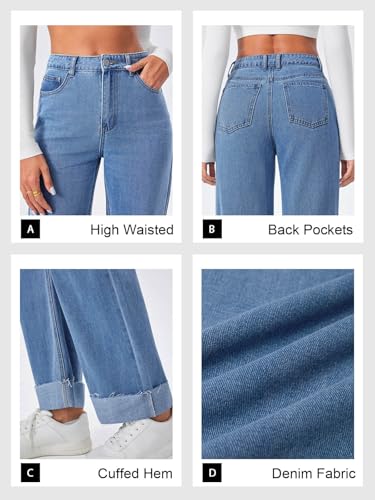 Cicy Bell Womens High Waisted Boyfriend Jeans Cuffed Raw Straight Leg Baggy Denim Pants with Pockets