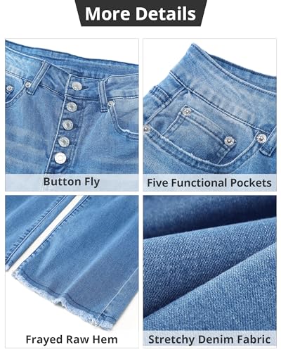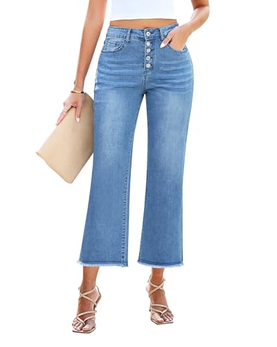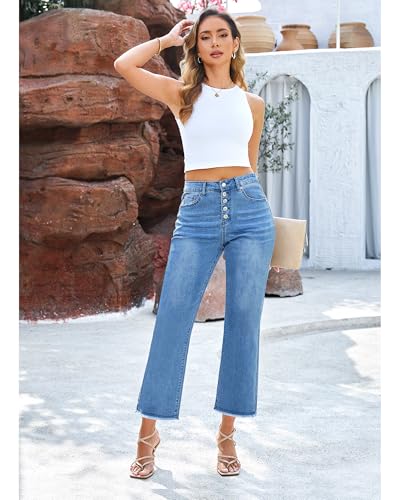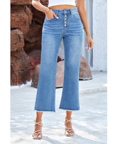 GRAPENT Capri Jeans for Women Trendy High Waisted Wide Leg Flare Button Fly Stretchy Denim Pants Raw Hem Cropped Jeans