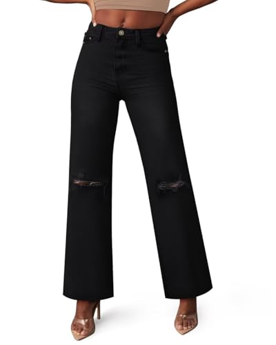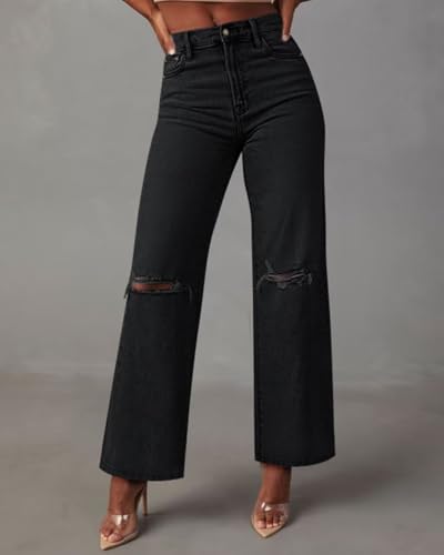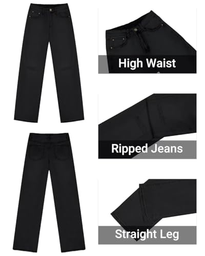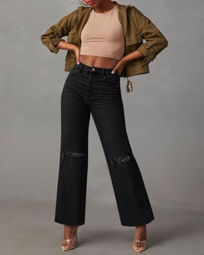 KDF Straight Leg Jeans for Women High Waisted Jeans Frayed Baggy Pants Raw Hem Loose Stretchy Cropped Wide Leg Jeans