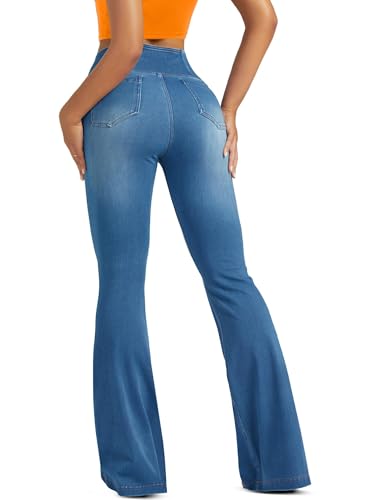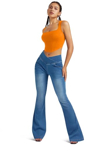 Knit Stretchy Jean Leggings for Women with Crossover High Waisted Bell Bottom Yoga Pants Flare Leggings with Pockets