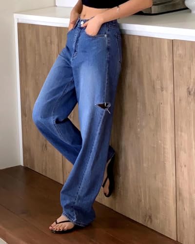 Necooer Women’s Casual Jeans Baggy Stretch Wide Leg Jeans Casual Distressed Ripped Boyfriend Denim Pants Trendy Fashion