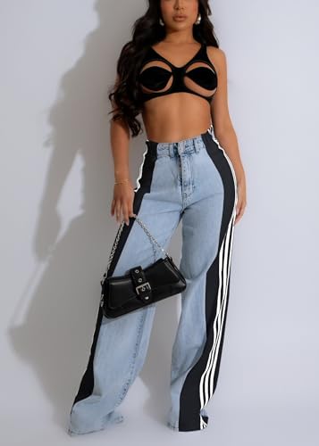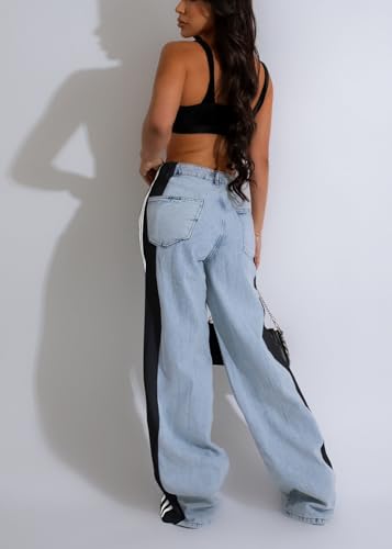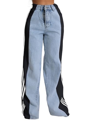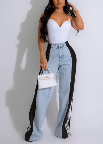 Nihsatin Women’s Two Tone Jeans Wide Leg High Waisted Stretchy Buttoned Denim Pants