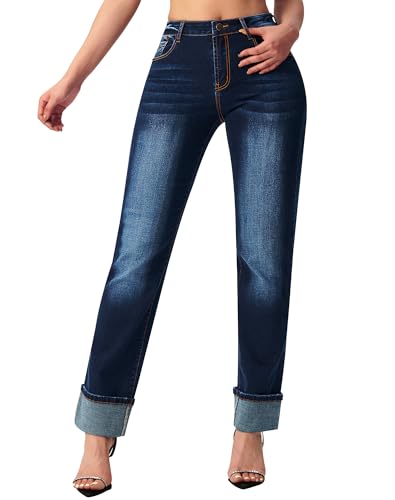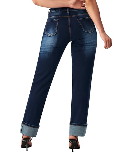 roswear Women’s Straight Leg Jeans High Waisted Boyfriend Stretchy Cuffed Denim Pants