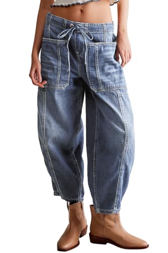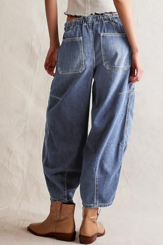 UNCLECAT Women’s Barrel Jeans Wide Leg Baggy Jean Elastic Low Rise Boyfriend Pants with Pockets