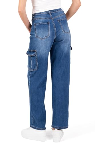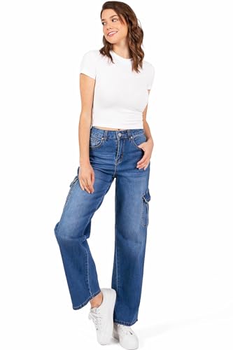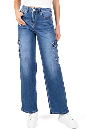 WAX JEAN Womens Juniors Wide Leg Cargo Carpenter Jeans (Medium Denim, 0)