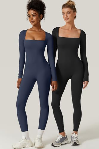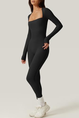 QINSEN Womens Sexy Square Neck Long Sleeve Full Length Leggings Bodycon Stretch Jumpsuit