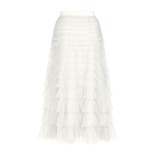Women’s Trendy Tiered Tulle Long Skirt Elastic High Waist A-Line Ruffle Tiered Layered Ruffled Swing Midi Skirts