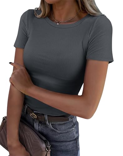 Roselux Women Crew Neck Ribbed Fitted Tight Tshirt Short Sleeve Shirt Basic Knit Top