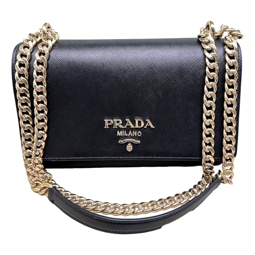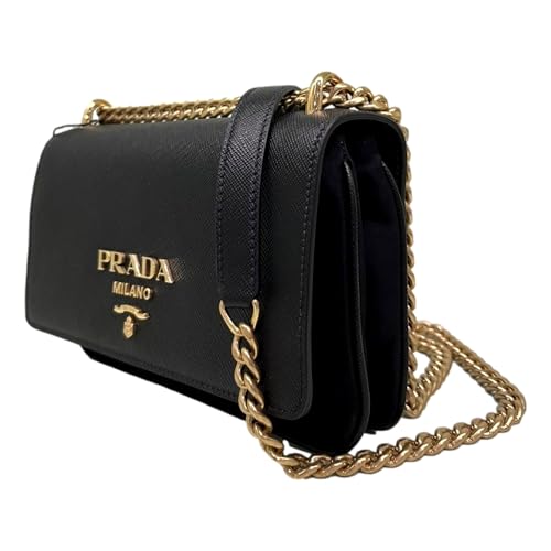 Elevate your style with this chic and luxurious Prada handbag from Milan, Italy. Crafted with impeccable attention to detail, this bag includes a sleek saffiano leather exterior in a classic black hue, adorned with the enduring Prada logo. The sturdy chain strap adds a touch of glamour, allowing you to hold it as a shoulder bag or crossbody. Inside, you can find ample space to store your essentials, keeping them organized and easily accessible. With its timeless design and premium quality, this Prada handbag is a sophisticated investment piece with the intention to complement any outfit, whether you are dressing up for a special day or running errands around the city. Indulge within the epitome of Italian craftsmanship and elevate your on a regular basis looks.