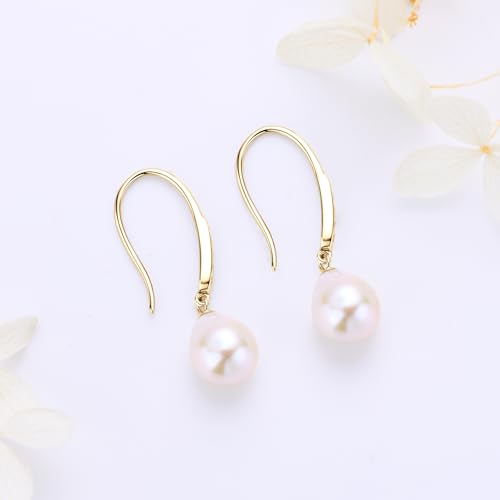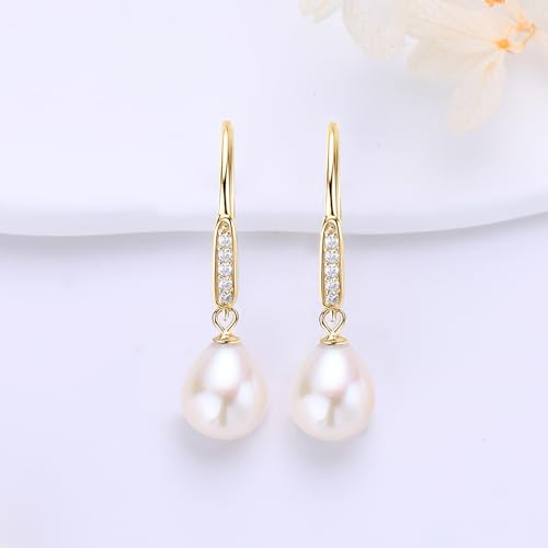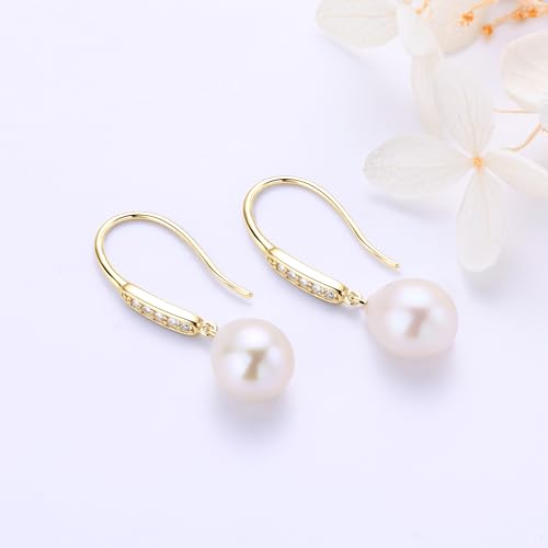 Freshwater Pearl Drop Earrings, 925 Sterling Silver 9-10mm Cultured Pearls Dangle Earrings with Cubic Zirconia, Wedding Anniversary Jewelry Gifts for Women Wife Bride