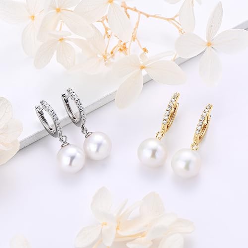 Freshwater Pearl Hoop Drop Earrings, 925 Sterling Silver Gold Hoops Earring with Sparkly Moissanite Diamond, Pearl Jewelry Gifts for Women