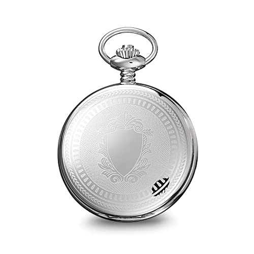 Perfect for engraving, the Charles-Hubert, Paris Stainless Steel Quartz Pocket Watch #3599-B combines an etched crest design on its front cover and wealthy black dial with the cool elegance of silver-tone stainless steel construction. This well-made pocket watch has silver-tone Arabic numerals and hands, in addition to a date display at three o’clock. Quartz movement provides reliability, whilst a matching curb chain lends real unfashionable appeal. Designed to last a life-time, this Charles-Hubert original arrives in a deluxe blue giftbox.
