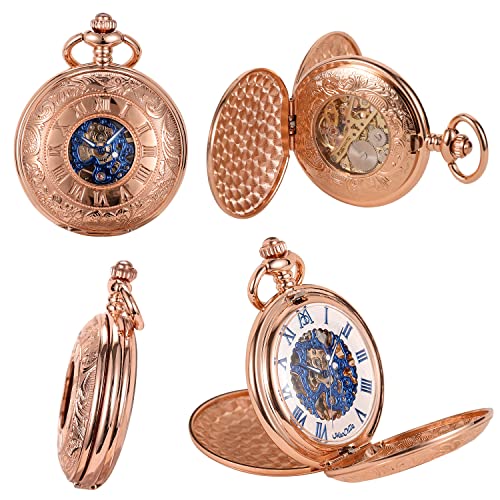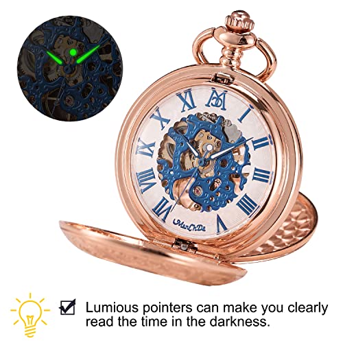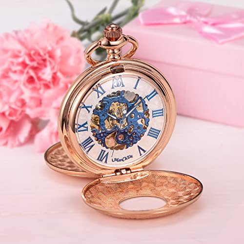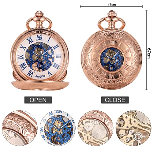 ManChDa Mechanical Roman Numerals Dial Skeleton Pocket Watches with Box and Chains for Mens Women