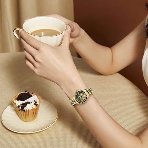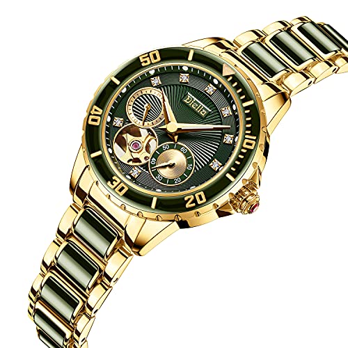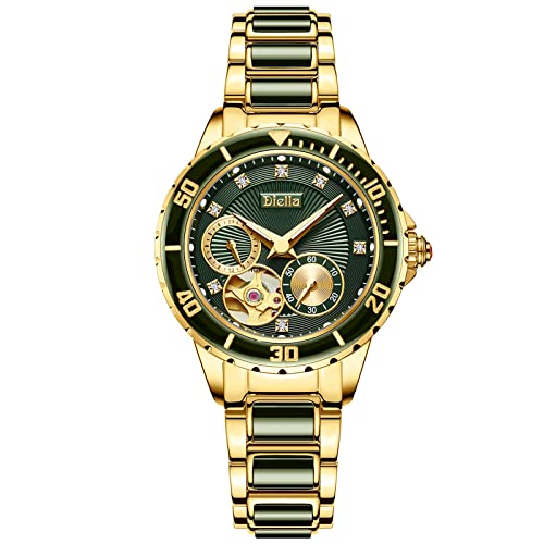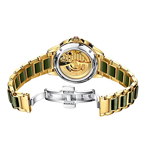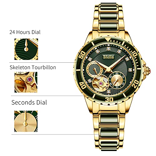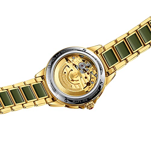Specification: Diella Automatic Watch for Women, Women Luxury Skeleton Tourbillon Watch, Gold Dress Wrist Watches for Ladies with Jade, Crown with Red Gem, Luminous, Waterproof (Model: AD6025L)
