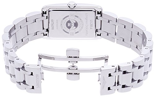 Silver dial. Silver-tone stainless-steel case with a silver-tone stainless-steel band. Quartz motion. 30 meters / 100 toes water resistance. Fastened bezel. Triple Fold Over clasp. Case dimension 32 mm x 20.5 mm. Longines L52554716 DolceVita Watch.