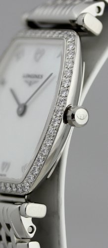 This magnificent Longines Stainless Steel Los angeles Grande Classique model # L4.288.0.09.6 / L42880096 will make a super gift or an ideal addition on your collection. Designed with enduring materials and trendy designs presenting the Women’s prestigious Los angeles Grande Classique de Longines. This watch includes a beautiful Mother-of-Pearl dial set with Silver tone Roman Numeral hour markers, 52 Dazzling Diamonds set on Bezel, Scratch Resistant Sapphire Crystal, Stainless Steel Case and Bracelet, Swiss Quartz Movement, Caliber L209, Water Proof against 30 meters/one hundred feet. Two Year Limited Warranty.