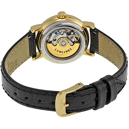 White dial enhanced via black palms. Yellow Gold-plated stainless-steel case with a black leather band. Automated motion. 30 meters / 100 toes water resistance. Mounted bezel. Scratch Resistant Sapphire crystal. Clear S caseback. Tang clasp. Pull / Push crown. Case dimension 25 mm x 8.4 mm. Band 13 mm x lengthy. Longines L4.321.2.11.2 Presence Watch.