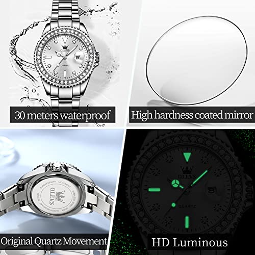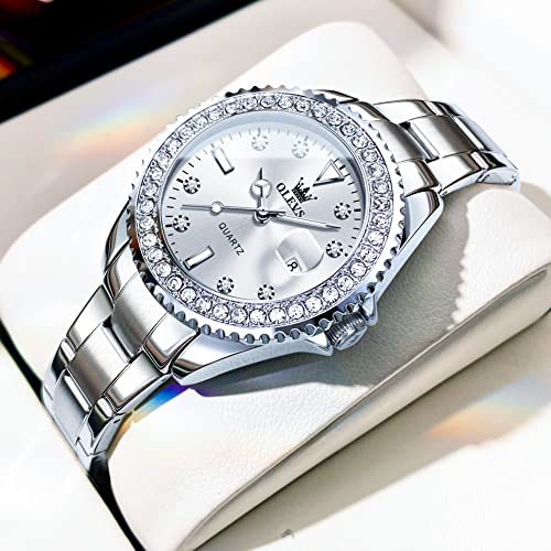 OLEVS Watches Women with Date Silver Stainless Steel Luxury Ladies Watches with Small Writs Diamond Watches for Women Waterproof Elegant Dress Quartz Analog Women’s Wrist Watches Reloj de Mujer