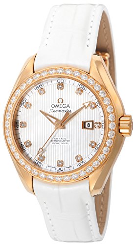 This classic yet powerful timepiece represents a tribute to OMEGA’s wealthy maritime heritage. The dramatic and simply-recognisable dial design of the OMEGA Seamaster Aqua Terra 150M collection recalls the picket decks of luxury sailboats. This model includes a white mother-of-pearl dial decorated with diamond-set indexes, the Teak Concept pattern and a date window on the 3 o’clock position. A scratch-resistant sapphire crystal protects this distinctive dial. The diamond-set bezel is mounted on a 34 mm 18K red gold case on a white leather strap. This certified chronometer is powered by the OMEGA Co-Axial calibre 8521 which will also be seen throughout the clear caseback.