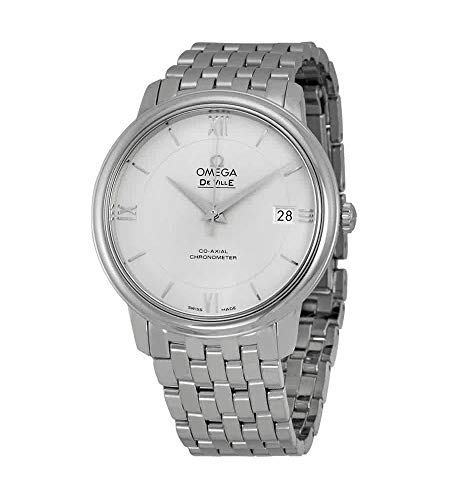 Silver dial. Silver-tone chrome steel case with a silver-tone chrome steel band. Computerized motion. 30 meters / 100 toes water resistance. Fastened bezel. Fold Over clasp. Case measurement 36.8 mm x 10 mm. Omega 424.10.37.20.02.001 De Ville Status Co-Axial Watch.
