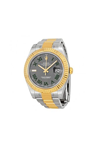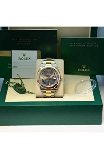Stainless steel case with a chrome steel with 18kt yellow gold bracelet. Fixed 18k yellow gold fluted bezel. Gray dial with luminous gold-tone hands and Roman numeral hour markers. Minute markers across the outer rim. Dial Kind: Analog. Luminescent hands and dial markers. Date display on the 3 o’clock position. Automatic movement. Scratch resistant sapphire crystal. Yellow gold crown. Solid case back. Case diameter: 41 mm. Spherical case form. Waterproof at 100 meters/ 330 feet. Purposes: date, hour, minute, second. Luxury watch taste. Watch label: Swiss Made. Rolex Datejust II Gray Roman Dial 18kt Yellow Gold Bezel Two Tone Oyster Bracelet Mens Watch