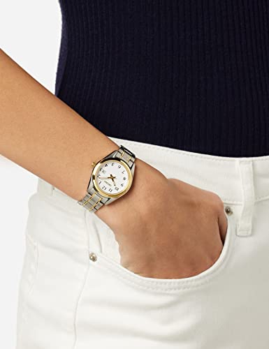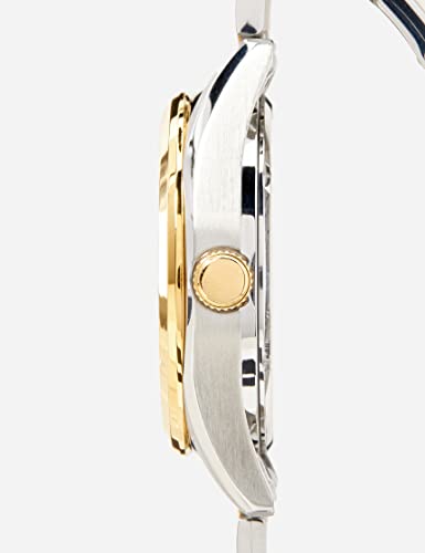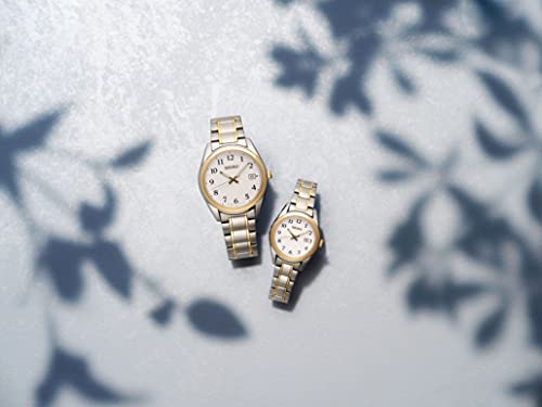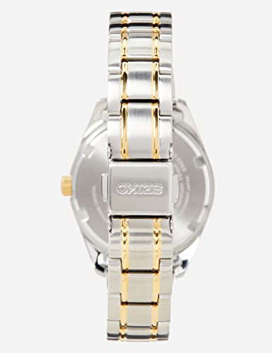 Seiko women quartz watch with white dial, gold plated bezel and complemented via a toned chrome steel bracelet. Waterproof as much as 100 metres.