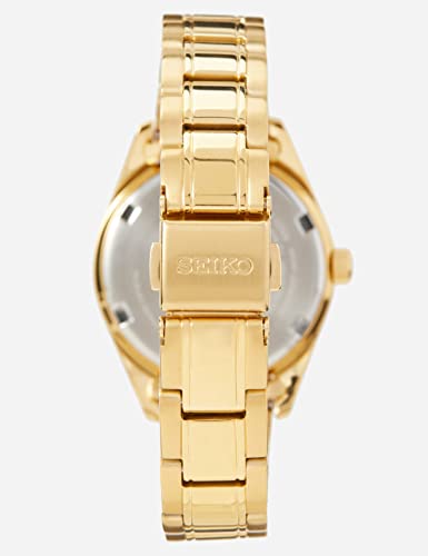 Silver dial. Gold-tone chrome steel case with a gold-tone chrome steel band. Quartz motion. 100 meters / 330 toes water resistance. Mounted bezel. Fold Over with Push Button Free up clasp. Case measurement 29.8 mm x 8.3 mm. Seiko SUR632P1 Neo Vintage Watch.