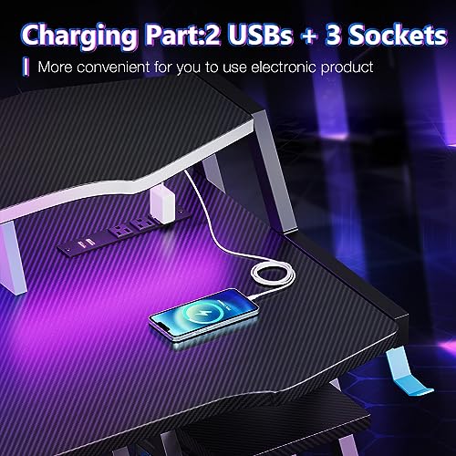 Specification: MOTPK Gaming Desk with Power Outlet & LED Lights, Gaming Computer Desk 47inch with PC Storage Shelf, Gaming Table with Carbon Fiber Texture, Gamer Desk, Gift for Boys Men, Black
